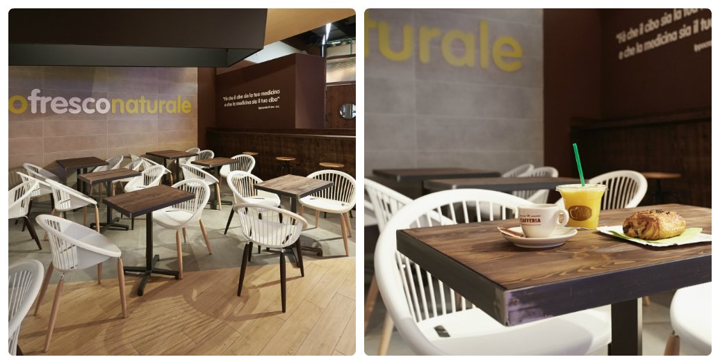 Теплые тона сочетаются с яркими красками фруктов и овощей, которые клиенты могут выбрать самостоятельно для своих блюд. Во время шоппинга, посетители могут отдохнуть на удобных креслах Natural Giulia и попробовать вкусные блюда за столом с подстольем Cross, которые созданы фабрикой Scab Design.