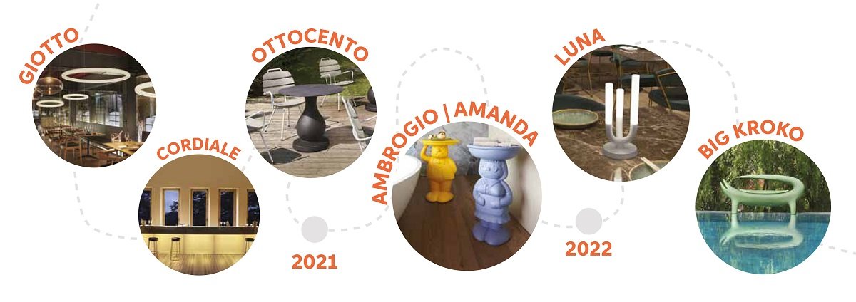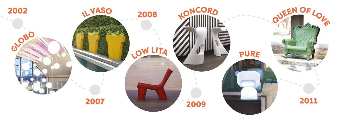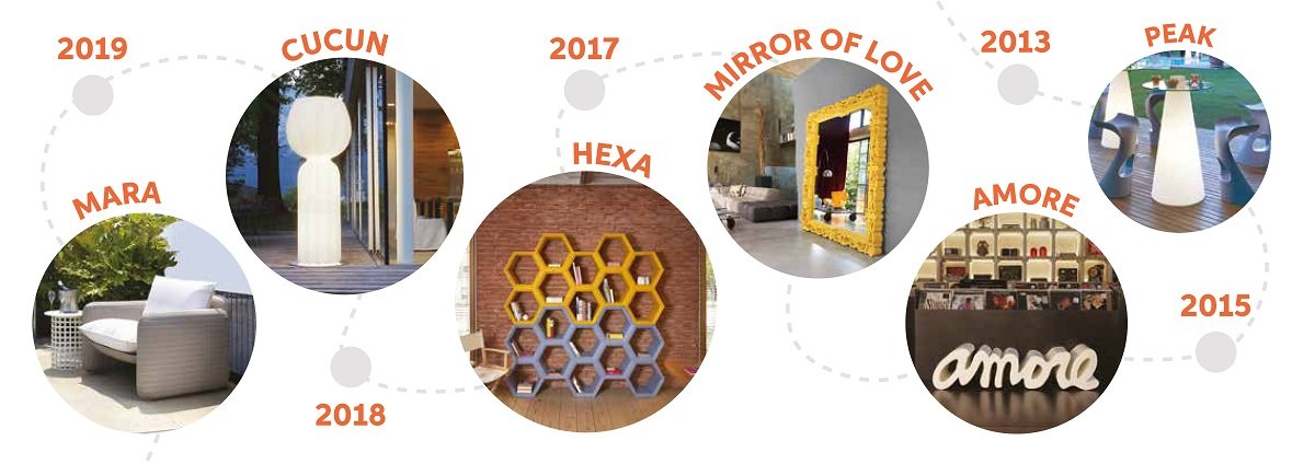 В 2002 году появилась первая простая и волшебная идея: геометрическая форма, похожая на сферу, выполненная из полупрозрачного полиэтилена. Внутри вставлена лампочка, создающая однородный свет с потрясающим эффектом. Вторая гениальная идея, появившаяся в 2006 году, заключалась в том, чтобы использовать ту же технику для создания больших предметов мебели, таких как барные стойки: так родился свет, который является мебелью. Крупные предметы мебели, которые к тому же очень легкие в перемещении и способны создать нужную световую атмосферу на открытом воздухе и в помещении, сразу стали обязательными в сфере мероприятий.