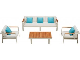 Кроме того толстые подушки делают эту коллекцию одной из самых удобных и приятных благодаря использованию быстросохнущей пены, покрытой текстильным материалом, который уравновешивает принципы долговечности и мягкости. Не говоря уже о элементах из натурального дерева, которые при необходимости можно использовать в качестве удобных боковых столиков.