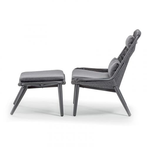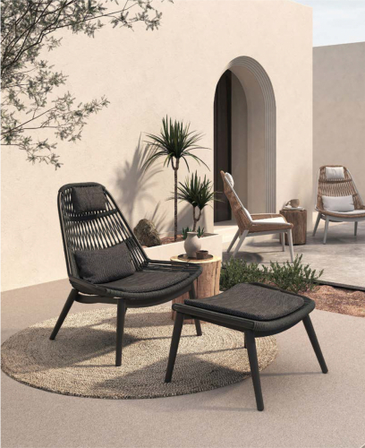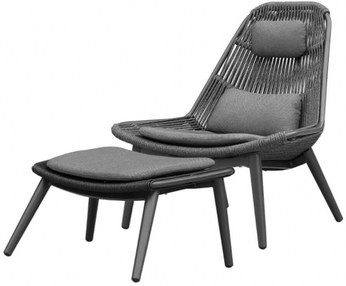 Кресло-шезлонг Como в комплекте с пуфом-подставкой для ног обеспечивает комфортный отдых на открытом воздухе. Алюминиевый каркас с порошковым покрытием делает мебель устойчивой и надежной. Оплетка каркаса сделана из полиэстерового каната. Мягкие подушки выполнены из стойкого к загрязнениям водооталкивающего олефина. Благодаря материалам кресло-шезлонг можно разместить на любой открытой площадке: на террасе, в саду, возле бассейна, на пляже.