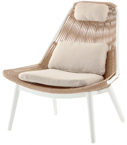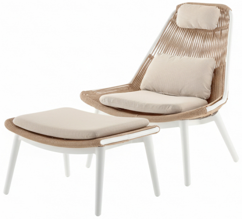 Кресло-шезлонг Como в комплекте с пуфом-подставкой для ног обеспечивает комфортный отдых на открытом воздухе. Алюминиевый каркас с порошковым покрытием делает мебель устойчивой и надежной. Оплетка каркаса сделана из полиэстерового каната. Мягкие подушки выполнены из стойкого к загрязнениям водооталкивающего олефина. Благодаря материалам кресло-шезлонг можно разместить на любой открытой площадке: на террасе, в саду, возле бассейна, на пляже.
