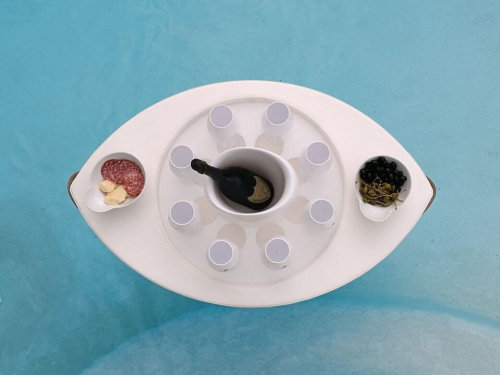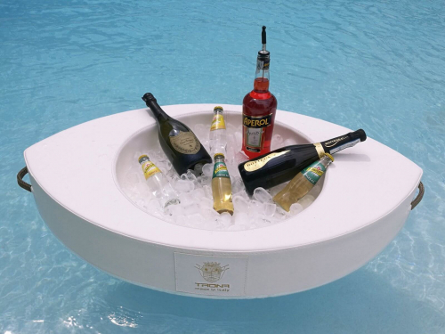 Плавающий бар Trona в форме глаза специально разработан для коктейльных вечеринок прямо в бассейне. Благодаря форме на его большую поверхность можно положить еду и закуски. Перфорированная пластина из оргстекла удерживает стаканы и ведра с бутылками в полной безопасности, без риска их опрокидывания. Это изделие сохраняет свое качество с течением времени, а благодаря покрытию из сертифицированной экокожи и ручкам из морской веревки плавающий бар в форме глаза является функциональным аксессуаром как в воде, так и за ее пределами.