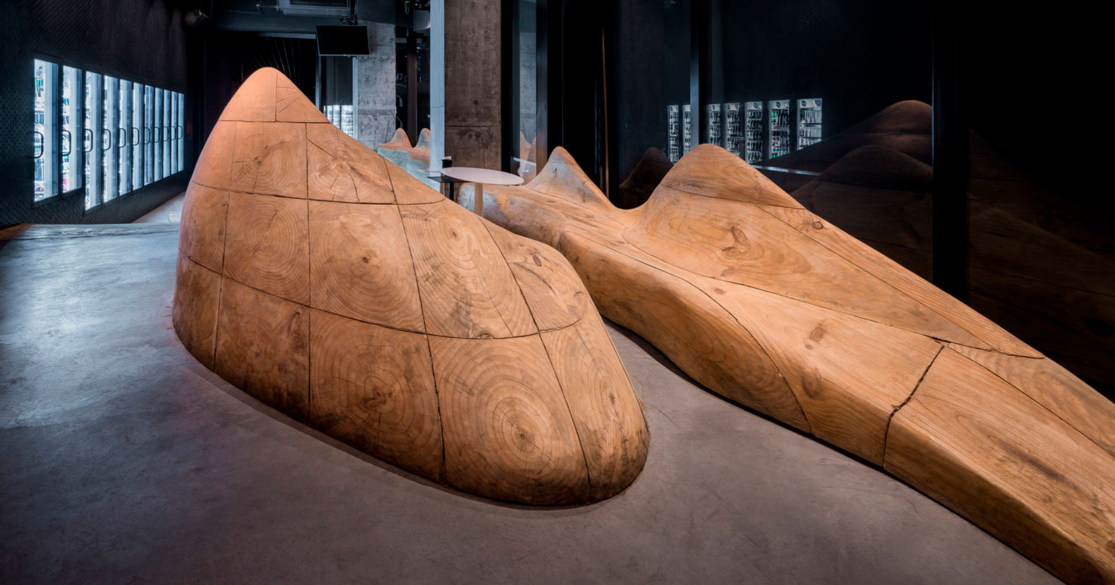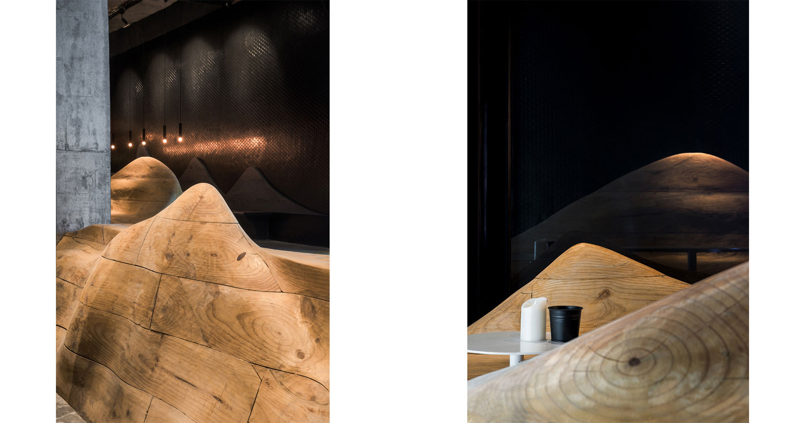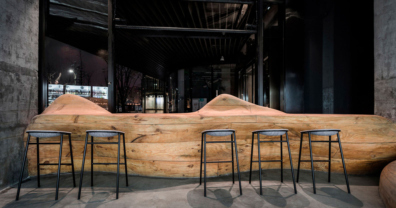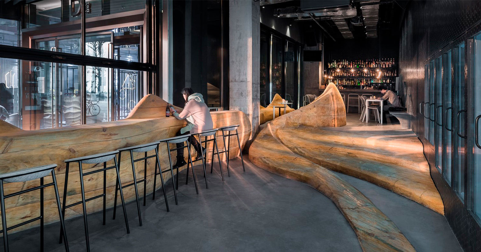 Паб в г. Чунцин (Китай) архитекторы преобразили, руководствуясь желанием упомянуть местную топографию, ландшафт и климат. Архитекторы создали имитацию местности Чунцина с помощью своеобразных деревянных гор. Дерево здесь создает замечательное сочетание, при этом играет и функциональную роль. На этих плавных линиях «гор» удобно сидеть, лежать или опираться на них. Из дерева выполнена также барная стойка и ступени.