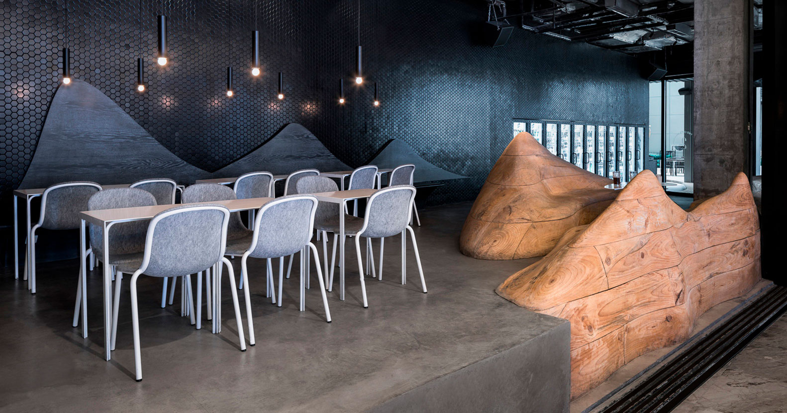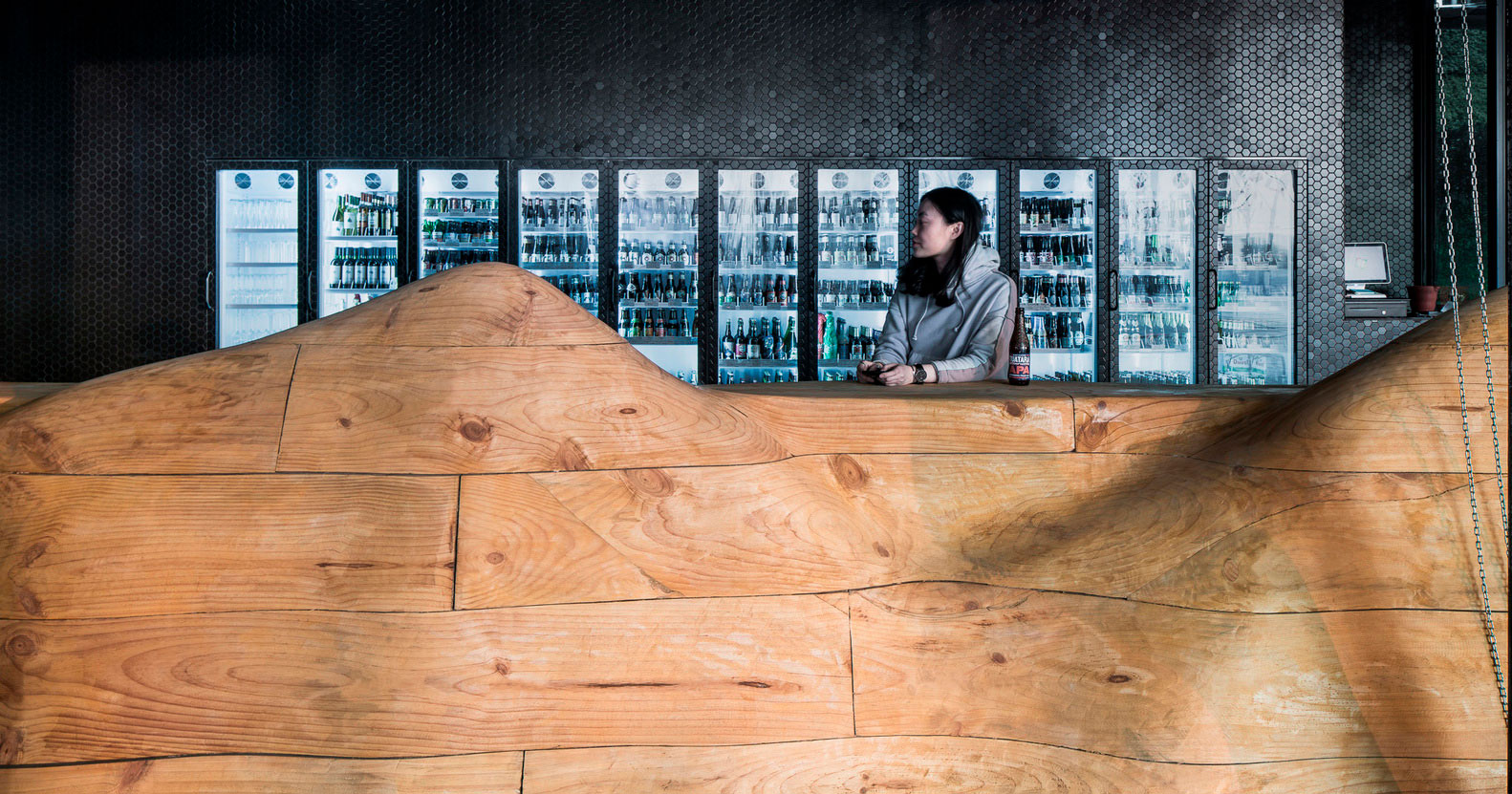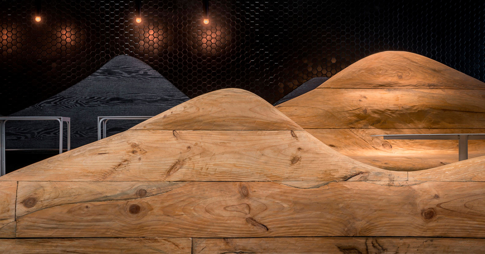 Паб в г. Чунцин (Китай) архитекторы преобразили, руководствуясь желанием упомянуть местную топографию, ландшафт и климат. Архитекторы создали имитацию местности Чунцина с помощью своеобразных деревянных гор. Дерево здесь создает замечательное сочетание, при этом играет и функциональную роль. На этих плавных линиях «гор» удобно сидеть, лежать или опираться на них. Из дерева выполнена также барная стойка и ступени.