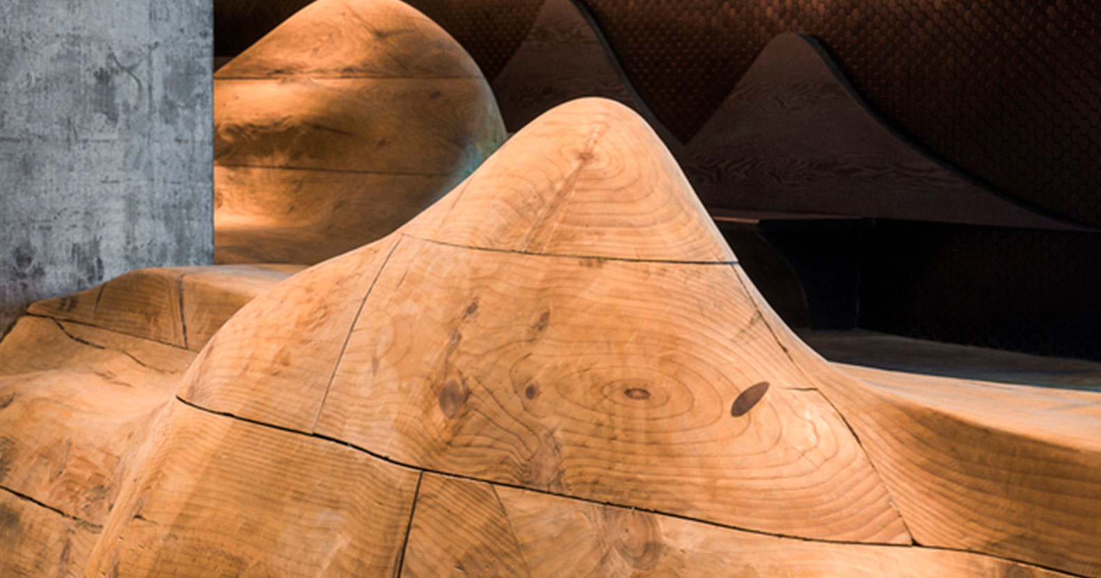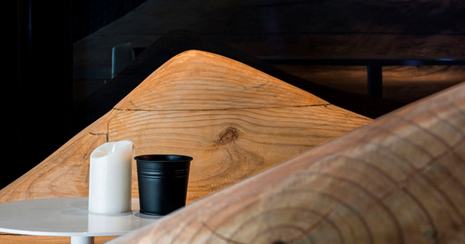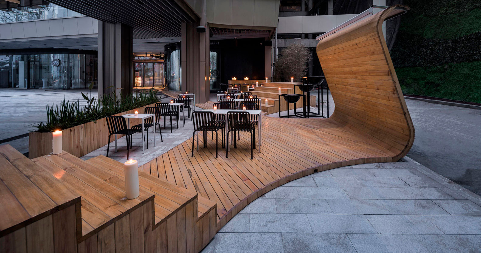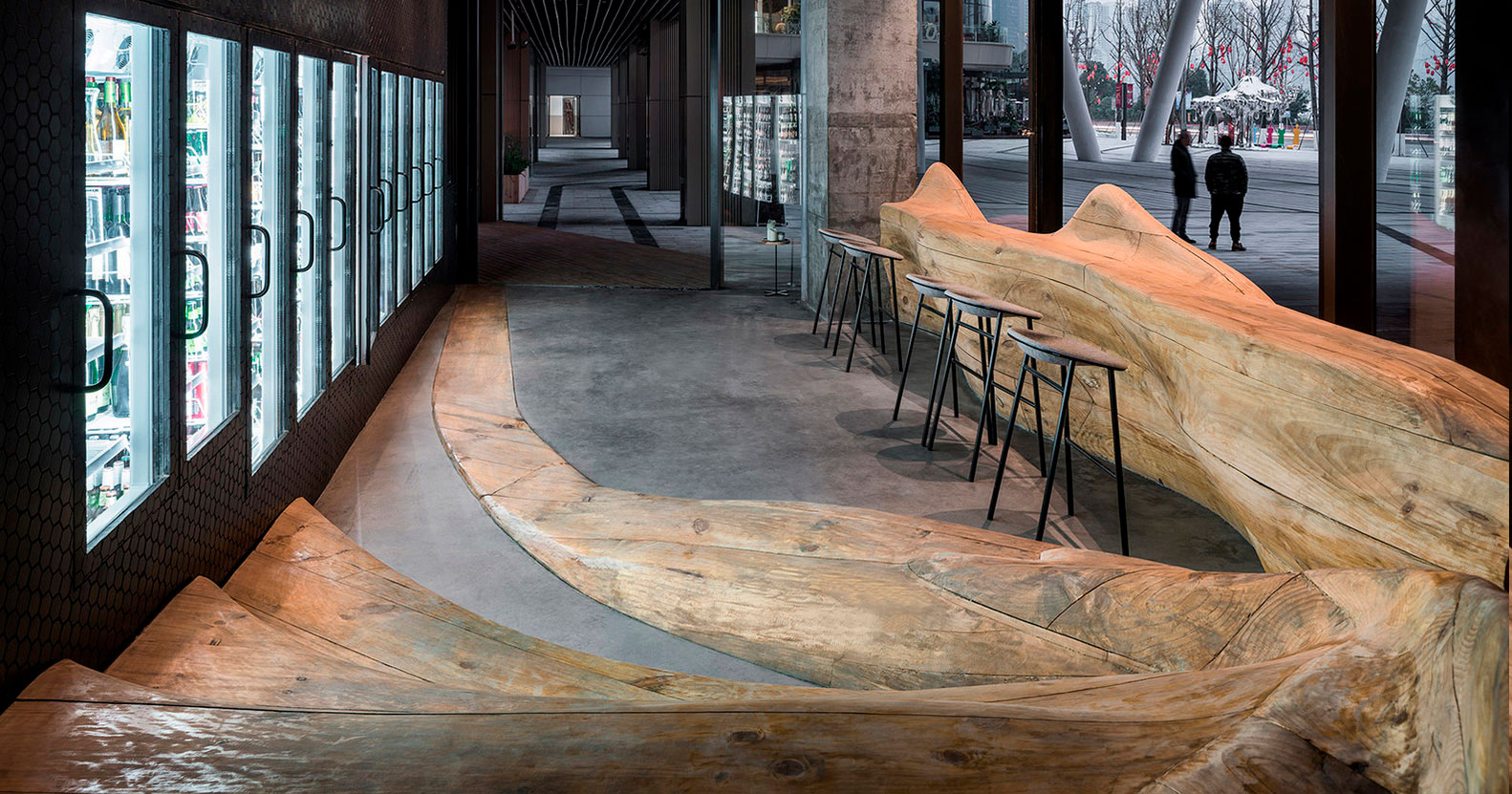 Паб в г. Чунцин (Китай) архитекторы преобразили, руководствуясь желанием упомянуть местную топографию, ландшафт и климат. Архитекторы создали имитацию местности Чунцина с помощью своеобразных деревянных гор. Дерево здесь создает замечательное сочетание, при этом играет и функциональную роль. На этих плавных линиях «гор» удобно сидеть, лежать или опираться на них. Из дерева выполнена также барная стойка и ступени.