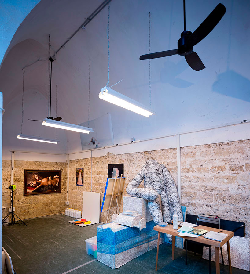 Вход в Beit kandinof представляет собой яркое белое пространство с баром из алюминиевых профилей. Вход ведет в главное пространство – ранее коммерческую улицу с магазинами – теперь здесь мастерские художников.