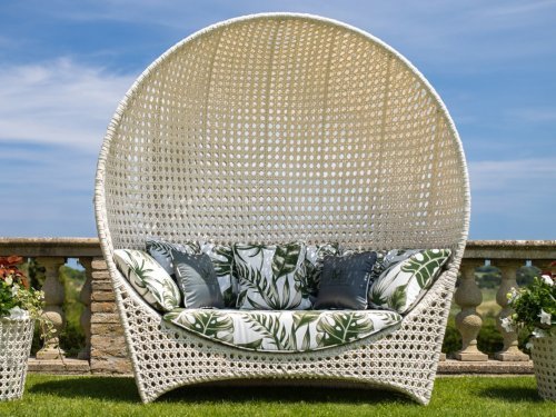 Плетеный диван Altair - уникальное и оригинальное произведение. Благодаря своей округлой структуре он напоминает концепцию ренессансного алькова. На открытом пространстве он дает уединение и комфорт, становясь настоящим гнездом, в котором можно уютно устроиться. Несмотря на свой размер, плетеный диван Altair предлагается в качестве легкого и гармоничного дополнения, которое со строгой элегантностью вписывается в пространство, что еще больше усиливает концепцию комфорта и расслабления на открытом воздухе.