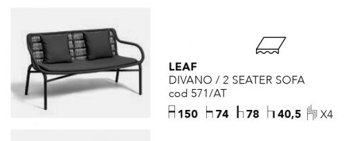 Новая коллекция Leaf ценится за свою элегантность и легкость. Коллекция имеет прочный алюминиевый каркас, обтянутый синтетическим канатом (роупом) ручной работы. Диван может дополняться кофейными столиками разной формы и размера, а также лаунж креслом для создания расслабляющей атмосферы на открытом пространстве.