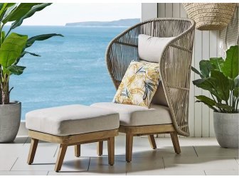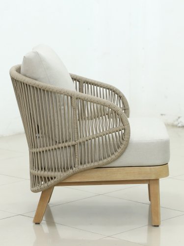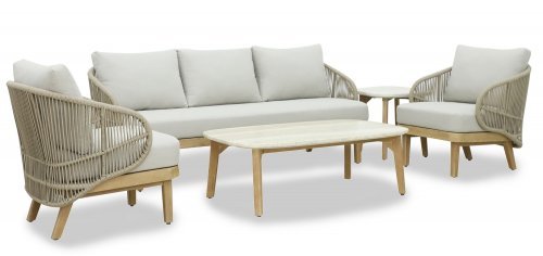 Эксклюзивная коллекция Mali приглашает вас окунуться в стиль и безмятежность на открытом воздухе. Кресла и диван, вдохновленные побережьем, имеют прочный алюминиевый каркас, оплетенный роупом, очаровательные ножки из эвкалипта и мягкие, удобные подушки, предназначенные для круглогодичного отдыха на открытом воздухе и развлечений. Кофейный столик выполнен из эвкалипта, столешница - из искусственного камня Travertine.