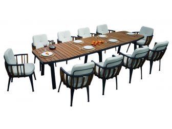 Для подушек выбран олефин, материал на основе полипропилена, легкий, с низкой степенью влагопоглощения и быстросохнущим. Превосходная устойчивость к солнечному свету и плесени, и, прежде всего, материал, который не выцветает. Идеально подходит для этой коллекции, где преобладает черный цвет: от черного цвета обивки до черного цвета алюминиевой конструкции с порошковым покрытием, которые, в отличие от искусного использования тикового дерева, создают ощущение сильной динамики.