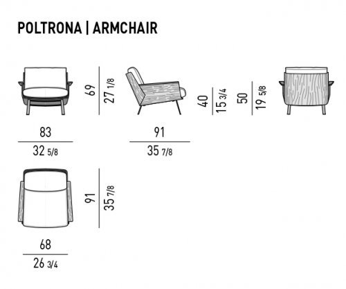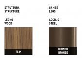 Изогнутый корпус из массива тика, созданный с использованием сложных технологий обработки дерева, состоит из двух элементов, соединенных под углом 45°, с наклонной спинкой, обеспечивающей максимальный комфорт. В варианте для открытого пространства корпус плотно прилегает к прошитым подушкам и установлен на каркасе из нержавеющей стали с полированными ножками бронзового цвета.