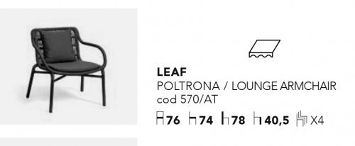 Новая коллекция Leaf ценится за свою элегантность и легкость. Коллекция имеет прочный алюминиевый каркас, обтянутый синтетическим канатом (роупом) ручной работы. Лаунж кресло может дополняться кофейными столиками разной формы и размера, а также диваномдля создания расслабляющей атмосферы на открытом пространстве.