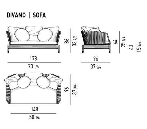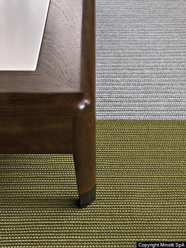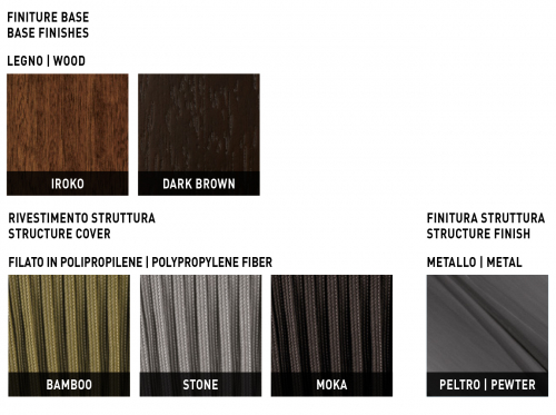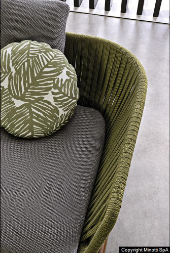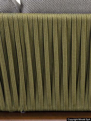 - Металлические спинки и подлокотники, прошедшие три этапа подготовки: пескоструйная обработка, цинковая грунтовка для наружного применения (облегчает и улучшает адгезию финишной краски) с полиэфирным порошковым покрытием для наружного использования с глянцевой отделкой цвета олово. Металлическая конструкция покрыта плетеным полипропиленовым волокном Taslan, которое образует полосу размером 24x7 мм. Волокно доступно в следующих цветах: бамбук, камень, мока.