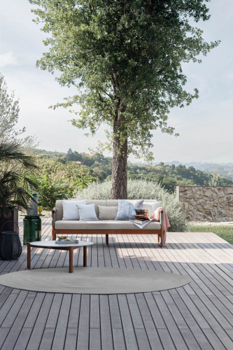 Мебель Atmosphera выполнена из тика, который выращивают на экологически устойчивых индонезийских плантациях. Богатое таниновым маслом, оно обеспечивает отличную стойкость даже в экстремальных условиях. Древесина устойчива к влажности, ультрафиолетовым лучам, холоду и резким перепадам температур. Поэтому это отличный материал для уличного применения. При длительном хранении тиковой мебели на открытом воздухе ее пигментация растворяется, приобретая мягкий серебристо-серый оттенок. Поскольку на начальном этапе это естественный процесс, серебристо-серый цвет может проявляться неравномерно. Чтобы сохранить первоначальный цветовой тон, фабрика предлагает специальный набор по уходу для использования один или несколько раз в год. Каркас из тикового дерева сочетается с тефлоновым акриловым канатом, ручного плетения, круглого сечения. Материал характеризуется "мягкостью", как ткань, устойчив к ультрафиолетовому излучению, водостойкий, легко чистятся, быстро сохнет.