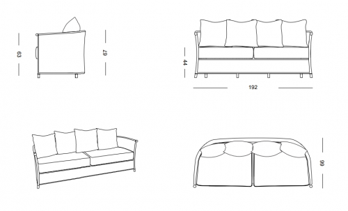 Чехлы подушек выполнены из уличных тканей - дышащих, водоотталкивающих, устойчивых к плесени, они не обесцвечиваются и устойчивы к УФ-лучам. Кроме того, их можно стирать в стиральной машине при 30 °C, и они просты в уходе. Чехлы подушек могут быть выполнены из тканей категорий C, D, E, F, G, S, а также из собственной ткани клиента. Посмотреть палитру материалов Samuele Mazza.