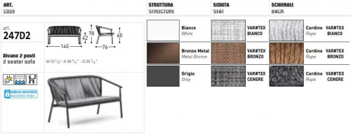Smart коллекция, состоящая из дивана, кресла-качалки, кресла, обеденного кресла и барного кресла с сиденьями из запатентованной Varaschin технической ткани VAR#TEX, спинкой из синтетического роупа VAR#ROPE и алюминиевого с порошковым покрытием. Изделия этой коллекции прочны, но легки, удобно штабелируются и хранятся, легко адаптируются к потребностям сферы Contract.