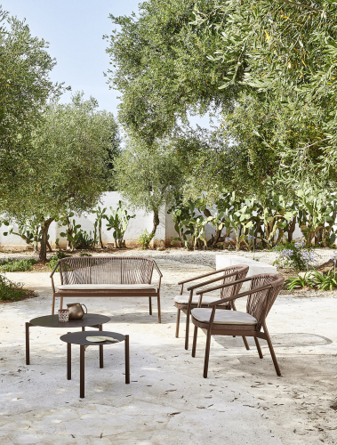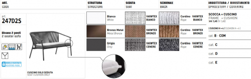 Smart коллекция, состоящая из дивана, кресла-качалки, кресла, обеденного кресла и барного кресла с сиденьями из запатентованной Varaschin технической ткани VAR#TEX, спинкой из синтетического роупа VAR#ROPE и алюминиевого с порошковым покрытием. Изделия этой коллекции прочны, но легки, удобно штабелируются и хранятся, легко адаптируются к потребностям сферы Contract.