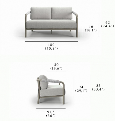 Двухместный диван Lorvain демонстрирует сдержанную элегантность и точность форм. Сочетает прочность и эстетическую утончённость: устойчивая к воздействию влаги и перепадам температур алюминиевая рама с порошковым покрытием обеспечивает долговечность при уличной эксплуатации, а детали из плетеной вручную акриловой веревки придают изделию благородную фактуру и визуальную лёгкость. Идеален для открытых пространств: террас, патио или садовых зон отдыха.