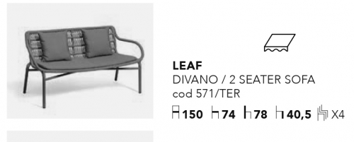 Новая коллекция Leaf ценится за свою элегантность и легкость. Коллекция имеет прочный алюминиевый каркас, обтянутый синтетическим канатом (роупом) ручной работы. Диван может дополняться кофейными столиками разной формы и размера, а также лаунж креслами: классическим и с высокой спинкой для создания расслабляющей атмосферы на открытом пространстве.
