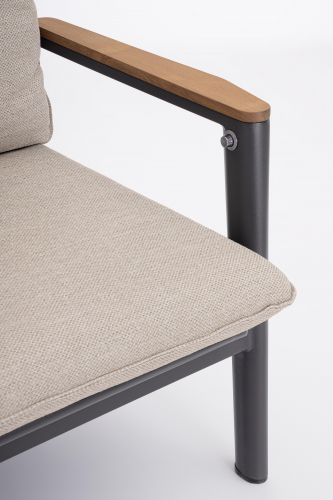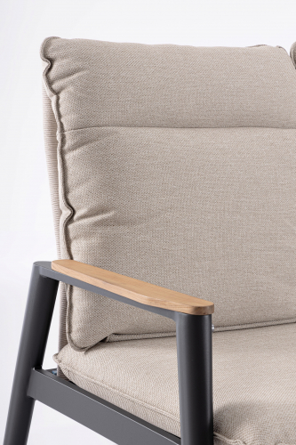 Диван Miguel станет идеальным дополнением вашего интерьера. Диван привлекает внимание и станет прекрасным дополнением гостиной зоны на открытом пространстве. Он изготовлен из алюминия и имеет мягкие подушки на сиденье и спинке. Подлокотники, украшенные тиковыми вставками, придают дивану особую изысканность и теплый акцент, а спинки легко откидываются, позволяя настроить уровень комфорта по своему желанию.