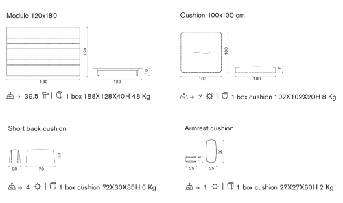 Calipso предлагается в трех разных модулях (1200x1200 мм, 1800x1200 мм и 2400x1200 мм), каждый из которых состоит из основания, изготовленного из планок из натурального тикового дерева разной ширины. Алюминиевая рама особенно незаметна, настолько, что сиденья кажутся «парящими». Мягкие сиденья доступны в трех размерах (1000x1000 мм, 1700x1000 мм и 2000x1000 мм) и «свободны» от основания, на которое они опираются, которое больше, чем сами подушки, чтобы обеспечить максимальную свободу в расположении каждого элемента в зависимости от потребности. Calipso предлагает новый способ наслаждаться жизнью на свежем воздухе с качеством, гибкостью, стилем и комфортом, легко удовлетворяя потребности жилых помещений, а также более сложные требования контрактных и гостиничных условий.