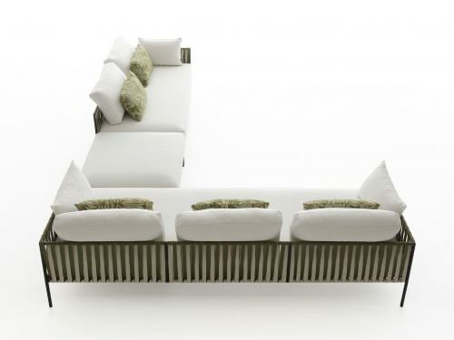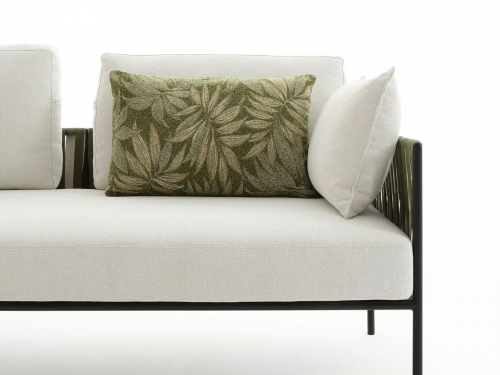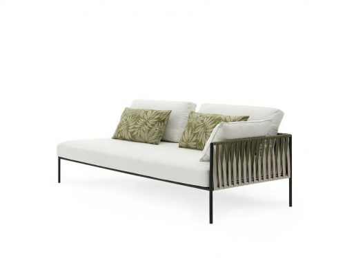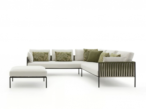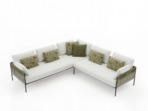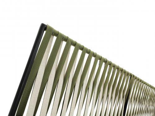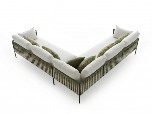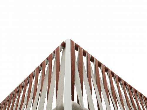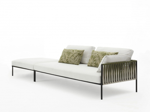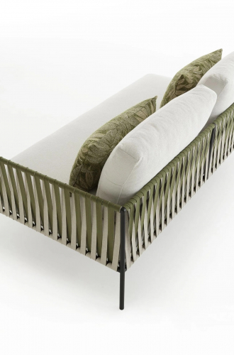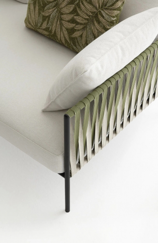 Основой служит прочный каркас из нержавеющей стали с порошковым покрытием, дополненный эластичными стропами для оптимального комфорта. Водоотталкивающие подушки с наполнителем в защитной мембране обиты тканью из перерабатываемых нитей Olyna™. Декоративное плетение выполнено двухцветными плоскими шнурами или косичками из того же износостойкого материала, подходящего для интерьера и улицы.