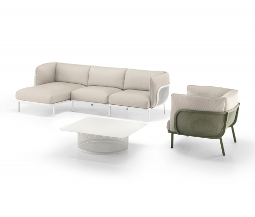 Cabla представляет собой модульную сборную систему мягкой мебели, позволяющую создавать множество конфигураций с использованием всего трех модулей: одного линейного сиденья, шезлонга и подлокотника. Металлическая основа конструкции из нержавеющей стали, продукт многолетнего опыта EMU, сочетается с комфортом и цветовым разнообразием тканей для наружного использования, достигая максимальной композиционной и выразительной пластичности в широком диапазоне настроек, даже для морского побережья. Кофейные столики с основанием из проволочной сетки различных форм и размеров дополняют коллекцию, предлагая множество вариантов проведения встреч с семьей и друзьями.
