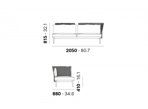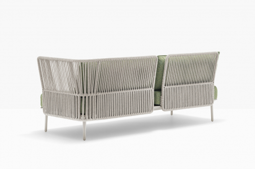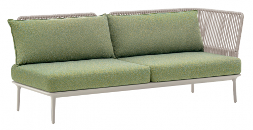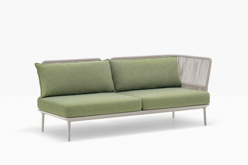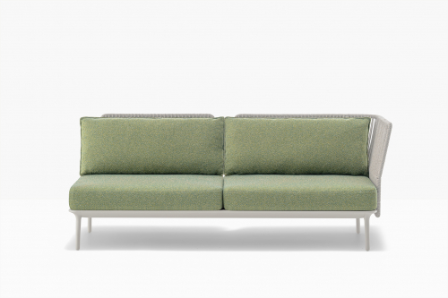 Версия Reva Cocoon с низкой спинкой, обладает отличительной особенностью в виде каркаса из нержавеющей стали, переплетенным веревкой из устойчивого к атмосферным воздействиям полипропилена, что придает всей коллекции по-настоящему естественный вид. Элемент каната, на 100% изготовленный в Италии опытными мастерами, обеспечивает жизненно важное уединение, сохраняя при этом предмет мебели воздушным и ярким благодаря более толстому плетению в нижней части и более свободному в верхней части. Левый угловой модуль с каркасом из экструдированного алюминия, на концах которого установлены четыре конические ножки из литого под давлением алюминия. Ощущение обволакивания усиливается мягкими подушками, которые опираются на конструкцию.