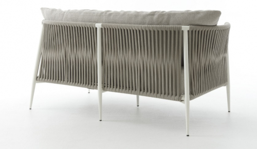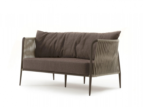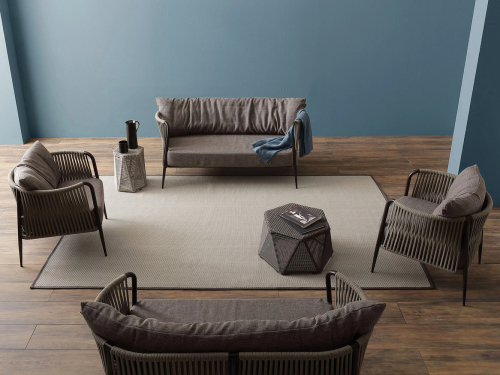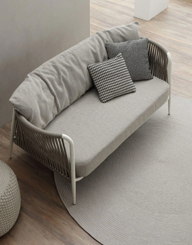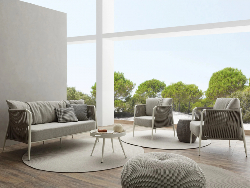 Коллекция Eva, воплощающая эстетику «современной классики», сочетает утончённость и гостеприимную привлекательность благодаря мягким округлым формам, сужающимся ножкам и изящному плетению, придающим мебели неповторимый шарм. Конструкция из алюминия с порошковым покрытием, плетение из высокопрочной нити Olyna®, водоотталкивающие подушки с тканью на основе Olyna™ и исключительный комфорт делают эту коллекцию идеальной для использования как в домашних, так и в коммерческих пространствах (бары, кафе, рестораны). Мебель ручного плетения предлагает более 20 вариантов комбинаций тканей и оплётки, ассортимент включает стул, кресло, двух- и трёхместные диваны, при этом все материалы водостойкие, перерабатываемые и могут быть дополнены защитными чехлами, устойчивыми к непогоде, что подчёркивает гармонию элегантности, долговечности и экологичности.