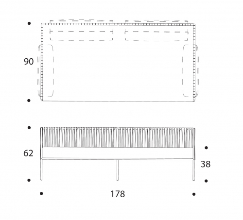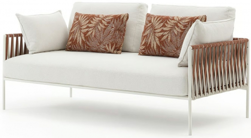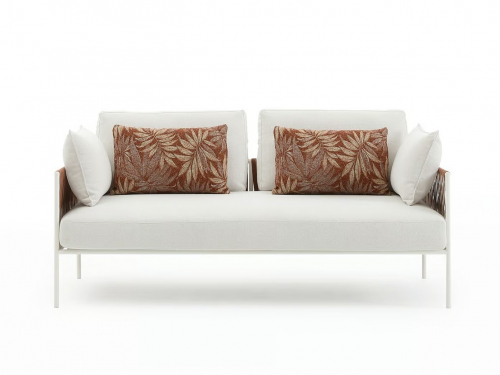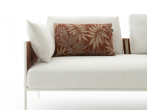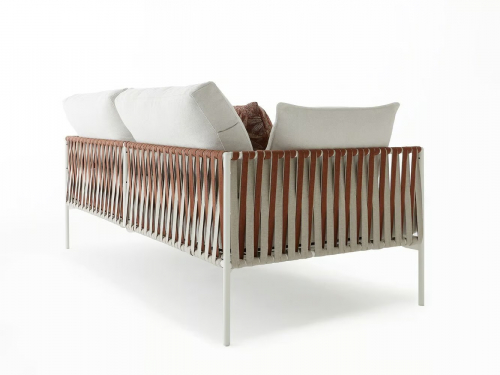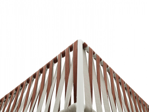 Основой служит прочный каркас из нержавеющей стали с порошковым покрытием, дополненный эластичными стропами для оптимального комфорта. Водоотталкивающие подушки с наполнителем в защитной мембране обиты тканью из перерабатываемых нитей Olyna™. Декоративное плетение выполнено двухцветными плоскими шнурами или косичками из того же износостойкого материала, подходящего для интерьера и улицы.