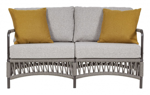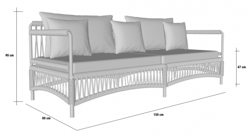 Диван Cannes формирует два комфортных сиденья, подчеркнутых симметричными подушками и нейтральной цветовой гаммой. Все элементы установлены на металлическом каркасе, украшенном переплетением канатов: веревочное плетение едва заметно на внешних подлокотниках, тогда как под сиденьем оно покрывает всю поверхность. Это идеальное место, чтобы погрузиться в мягкую, тактильно приятную атмосферу, воплощающую современный дизайн Made in Italy.