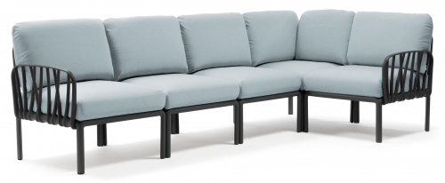 Модули Komodo выполнены из стеклопластика, имеют складные спинки и боковины, съемные подушки, благодаря чему можно составить диван любой длины, превратить отдельные модули в столики или пуфы.