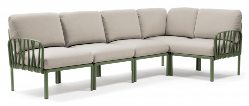 Модули Komodo выполнены из стеклопластика, имеют складные спинки и боковины, съемные подушки, благодаря чему можно составить диван любой длины, превратить отдельные модули в столики или пуфы.