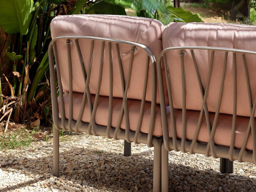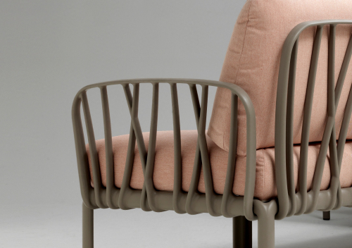 Ветвистая переплетенная конструкция вытекает из строгого геометрического дизайна, который также включает инновационную систему соединения между спинкой и сиденьем, осуществленную с помощью простого вращения. Последнее решение позволяет избежать непривлекательных стыков и открытых отверстий и поддерживает эстетическую гармонию плетенной конструкции на сиденье и спинке.