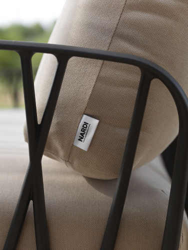 Ветвистая переплетенная конструкция вытекает из строгого геометрического дизайна, который также включает инновационную систему соединения между спинкой и сиденьем, осуществленную с помощью простого вращения. Последнее решение позволяет избежать непривлекательных стыков и открытых отверстий и поддерживает эстетическую гармонию плетенной конструкции на сиденье и спинке.