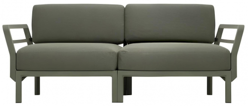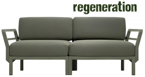 Изысканный, эстетически привлекательный дизайн: чистые и сбалансированные линии развиваются горизонтально, создавая ощущение глубины и длины; структура из переработанного пластика является цельной и прочной, но визуально облегченной за счет модульных треугольных секций и закругленных деталей. Большие объемы, удобное, глубокое сиденье и гибкая, гармоничная модульность.