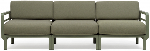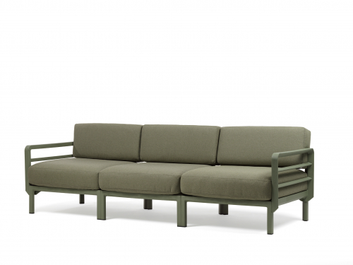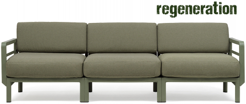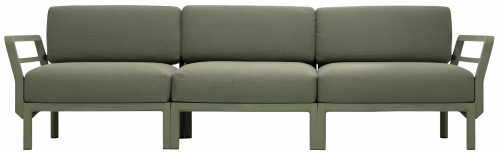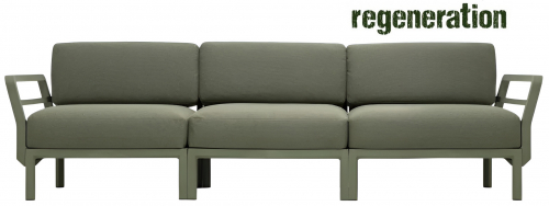 Изысканный, эстетически привлекательный дизайн: чистые и сбалансированные линии развиваются горизонтально, создавая ощущение глубины и длины; структура из переработанного пластика является цельной и прочной, но визуально облегченной за счет модульных треугольных секций и закругленных деталей. Большие объемы, удобное, глубокое сиденье и гибкая, гармоничная модульность.