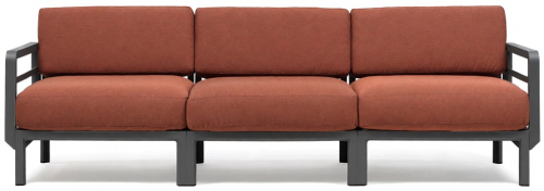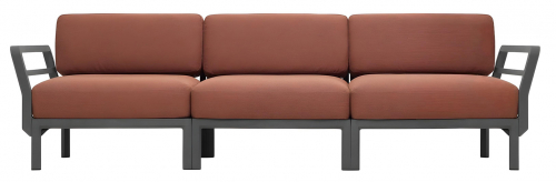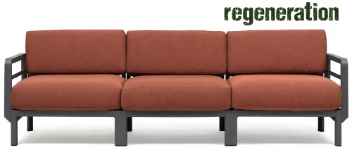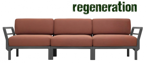 Изысканный, эстетически привлекательный дизайн: чистые и сбалансированные линии развиваются горизонтально, создавая ощущение глубины и длины; структура из переработанного пластика является цельной и прочной, но визуально облегченной за счет модульных треугольных секций и закругленных деталей. Большие объемы, удобное, глубокое сиденье и гибкая, гармоничная модульность.