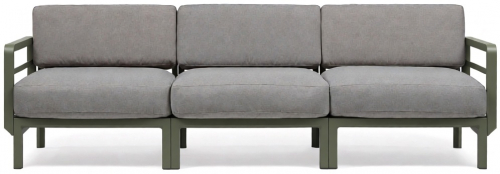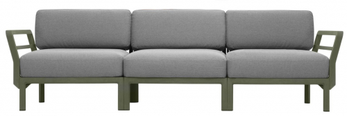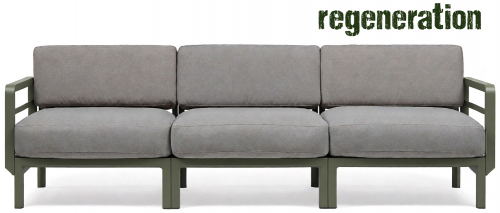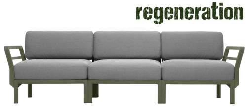 Изысканный, эстетически привлекательный дизайн: чистые и сбалансированные линии развиваются горизонтально, создавая ощущение глубины и длины; структура из переработанного пластика является цельной и прочной, но визуально облегченной за счет модульных треугольных секций и закругленных деталей. Большие объемы, удобное, глубокое сиденье и гибкая, гармоничная модульность.