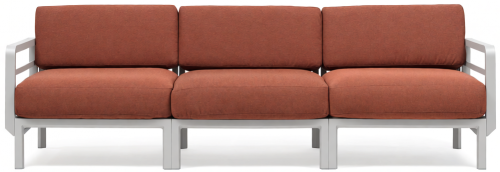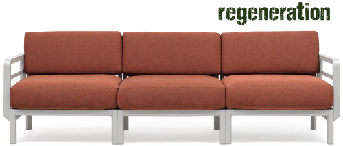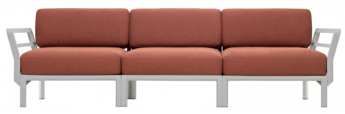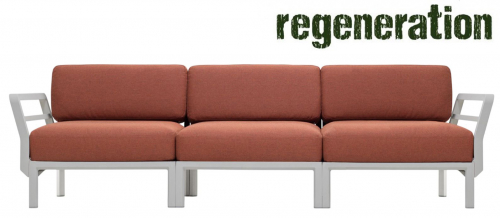 Изысканный, эстетически привлекательный дизайн: чистые и сбалансированные линии развиваются горизонтально, создавая ощущение глубины и длины; структура из переработанного пластика является цельной и прочной, но визуально облегченной за счет модульных треугольных секций и закругленных деталей. Большие объемы, удобное, глубокое сиденье и гибкая, гармоничная модульность.