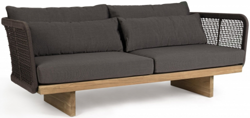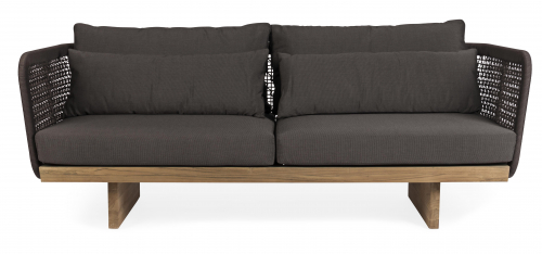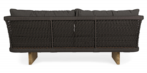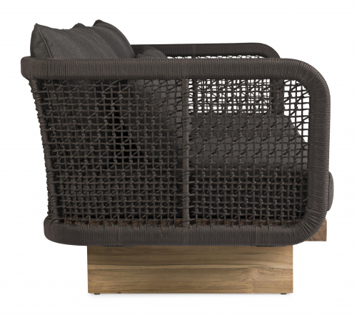 Сиденье и ножки выполнены из тика SVLK (легальное индонезийское дерево) с отделкой рустик. Каркас выполнен из алюминия с порошковой покраской (полиэстер), спинка и подлокотники оплетены полипропиленовым канатом, водоотталкивающим и устойчивым к ультрафиолету. Подушки с наполнителем из быстросохнущей пены (от влажности) и съемным чехлом из ткани sunbrella (100% акрил).