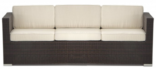 Трехместный диван Sole из синтетического ротанга (полиэтилен) выполнен в современном стиле. Каркас - из алюминия, это делает модель легкой и в то же время прочной, полиэтиленовое плетение - очень стойкий материал, подходящий для открытых пространств. Чехлы на подушках съемные. Модель прекрасно подойдет для террасы загородного дома или зоны отдыха в отеле или спа-комплексе.