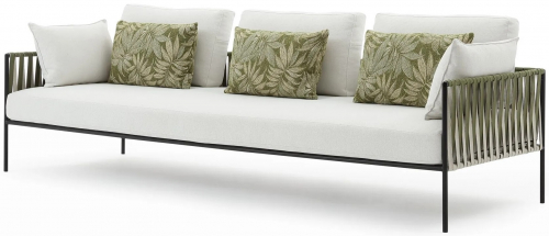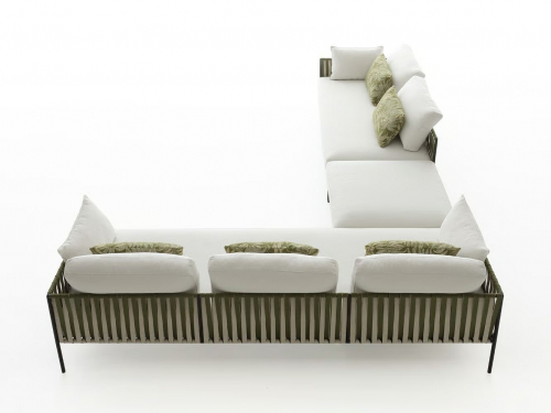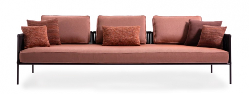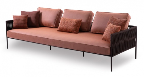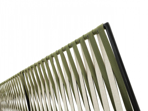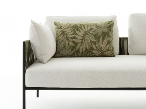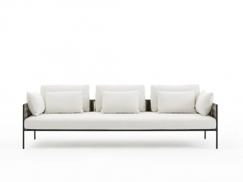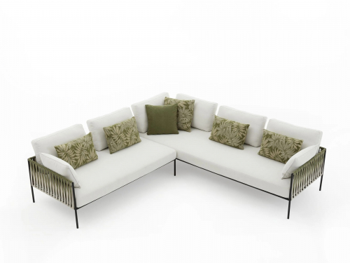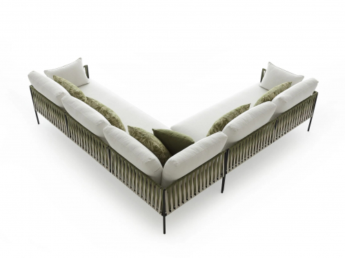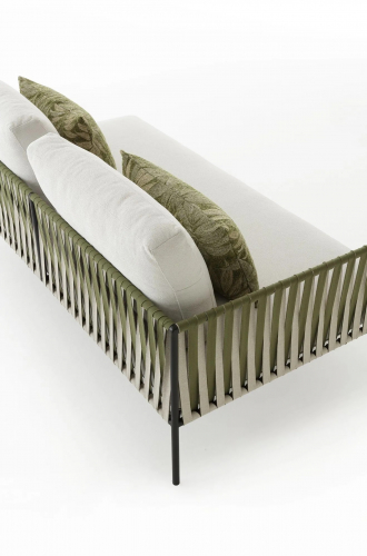 Основой служит прочный каркас из нержавеющей стали с порошковым покрытием, дополненный эластичными стропами для оптимального комфорта. Водоотталкивающие подушки с наполнителем в защитной мембране обиты тканью из перерабатываемых нитей Olyna™. Декоративное плетение выполнено двухцветными плоскими шнурами или косичками из того же износостойкого материала, подходящего для интерьера и улицы.