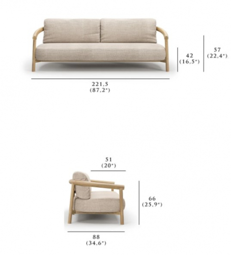 Конструкция, полностью выполненная из тикового дерева, украшена тонкой отделкой, что максимально повышает ее функциональность и эргономичность. Коллекция Lyora представлена креслами, а также двухместными и трехместными диванами компактных размеров и модульными конструкциями с обволакивающими линиями.