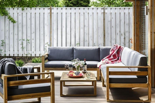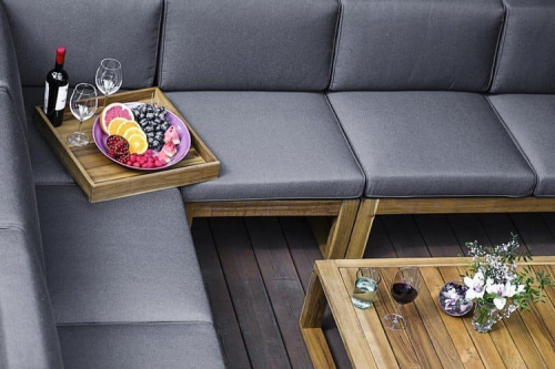 Прямые лаконичные линии мебели из коллекции Booka в сочетании теплого тона дерева и подушек в цвете темно-серый графит дают превосходные контрастные комплекты современной уличной мебели, которые по достоинству дополнят интерьер в стиле лофт или хайтек.
