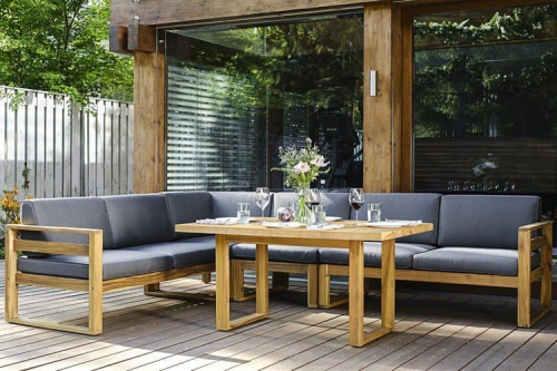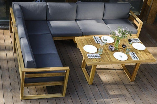 Прямые лаконичные линии мебели из коллекции Booka в сочетании теплого тона дерева и подушек в цвете темно-серый графит дают превосходные контрастные комплекты современной уличной мебели, которые по достоинству дополнят интерьер в стиле лофт или хайтек.