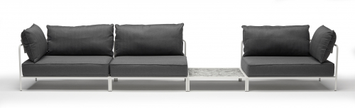Flap – это коллекция модульной мягкой мебели, в которой элементы объединены по композиции с опорными поверхностями. Отличительной частью конструкции являются элементы в спинке, напоминающие по форме закрылки самолета, с функцией поддержки задних подушек и способные поворачиваться вокруг оси примерно на 15 градусов: это позволяет подушке иметь разный наклон для достижения максимально возможной степени комфорта. Модули Flap подходят для различных условий использования как в жилом, так и в контрактном секторах. Обивка подушек предлагается в тщательно подобранных различных текстурах, чтобы гармонично вписаться в классическую или современную обстановку на открытом воздухе. Подушки выполнены из акриловой ткани и предназначены для использования на улице. Дополнением к элементам служит приставной кофейный столик с окрашенной стальной рамой и столешницей из компакт-ламината HPL.