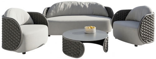 Комплект Mojo состоит из двухместного дивана, двух кресел и журнального столика. Устойчивый и надежный каркас кресел и дивана выполнен из алюминия и оплетен резиновым канатом с текстиленовой оплеткой. Подушки, выполненные из устойчивого к пятнам и ультрафиолетовому излучению олефина, обеспечивают комфортный отдых. Журнальный столик выполнен из алюминия. Стильный и удобный комплект можно разместить в зоне отдыха в помещении или на открытом воздухе.