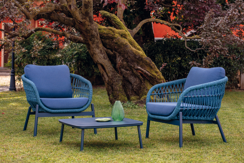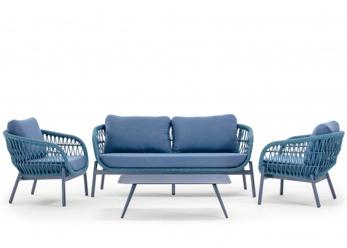 Уличный комплект Elba состоит из двухместного дивана, двух кресел и журнального столика со столешницей из алюминий. Алюминиевый каркас оплетен синтетическим роупом, мягкие подушки на сиденьях и спинках со съемными чехлами из олефина, устойчивого к загрязнениям и ультрафиолетовому излучению.