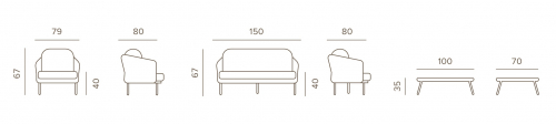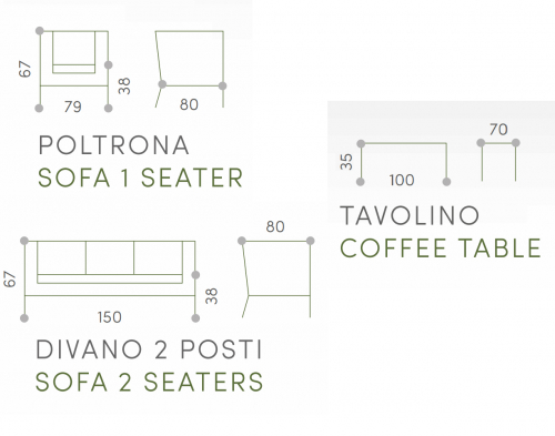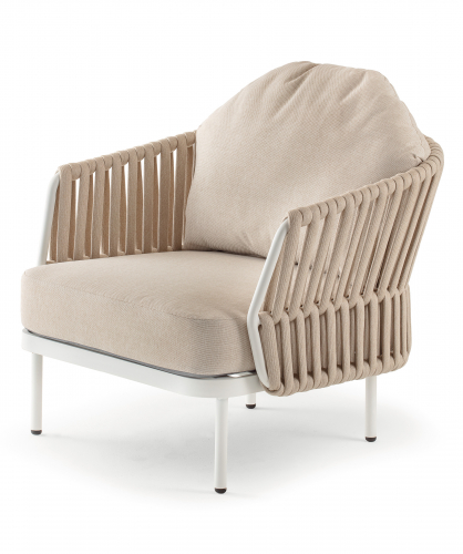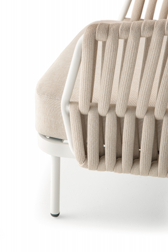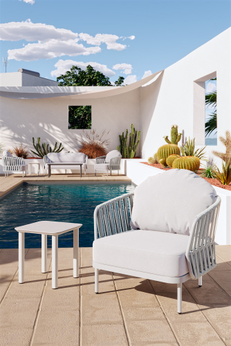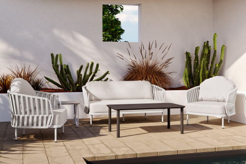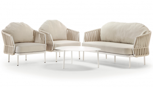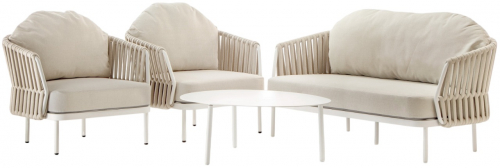 Уличный комплект Soho состоит из двухместного дивана, двух кресел и журнального столика со столешницей из алюминий. Алюминиевый каркас оплетен роупом (полиэстер и резина), мягкие подушки на сиденьях и спинках со съемными чехлами из олефина, устойчивого к загрязнениям и ультрафиолетовому излучению.